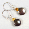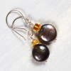 Romantic dark blue freshwater coin pearls, cheerful citrine rondelles, gold filled wavy beads, sterling silver earwires.