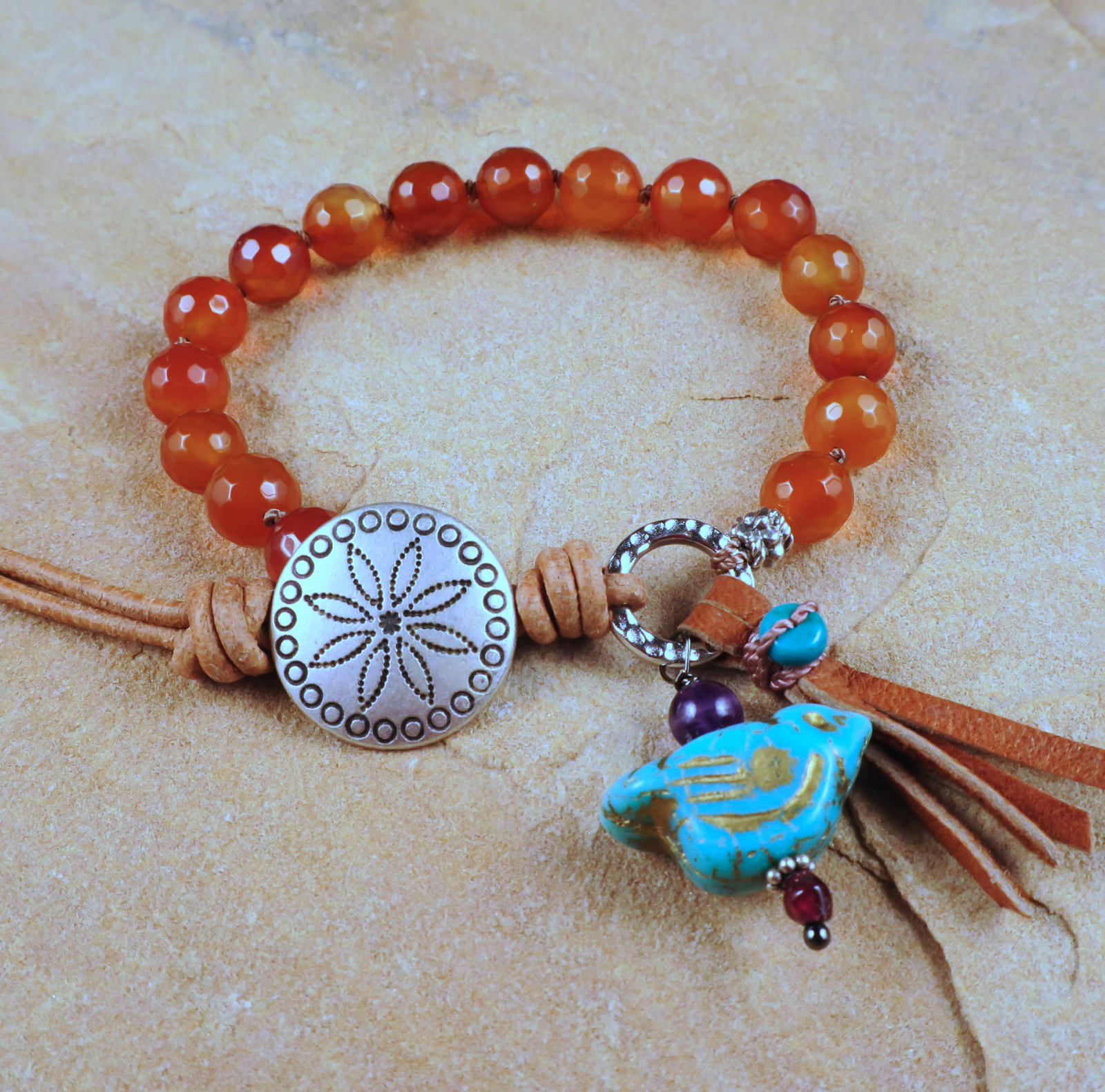 Faceted carnelian beads are hand knotted and combined with leather and Czech glass to make a great bracelet for stacking or wearing solo.